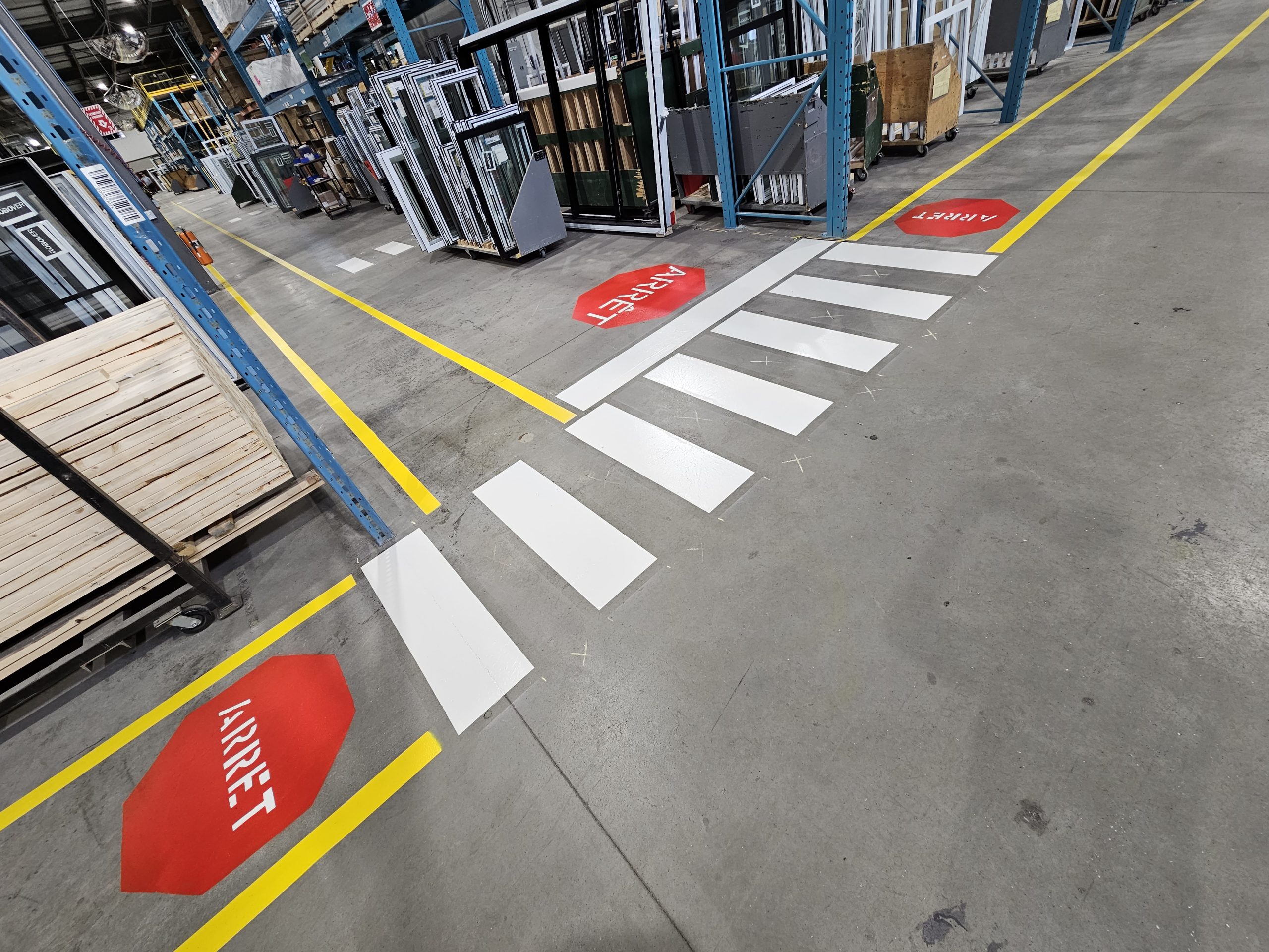 Aménagement visuel des espaces de travail : zones de sécurité, entreposage, circulation et logistique optimisée pour plus d’efficacité.