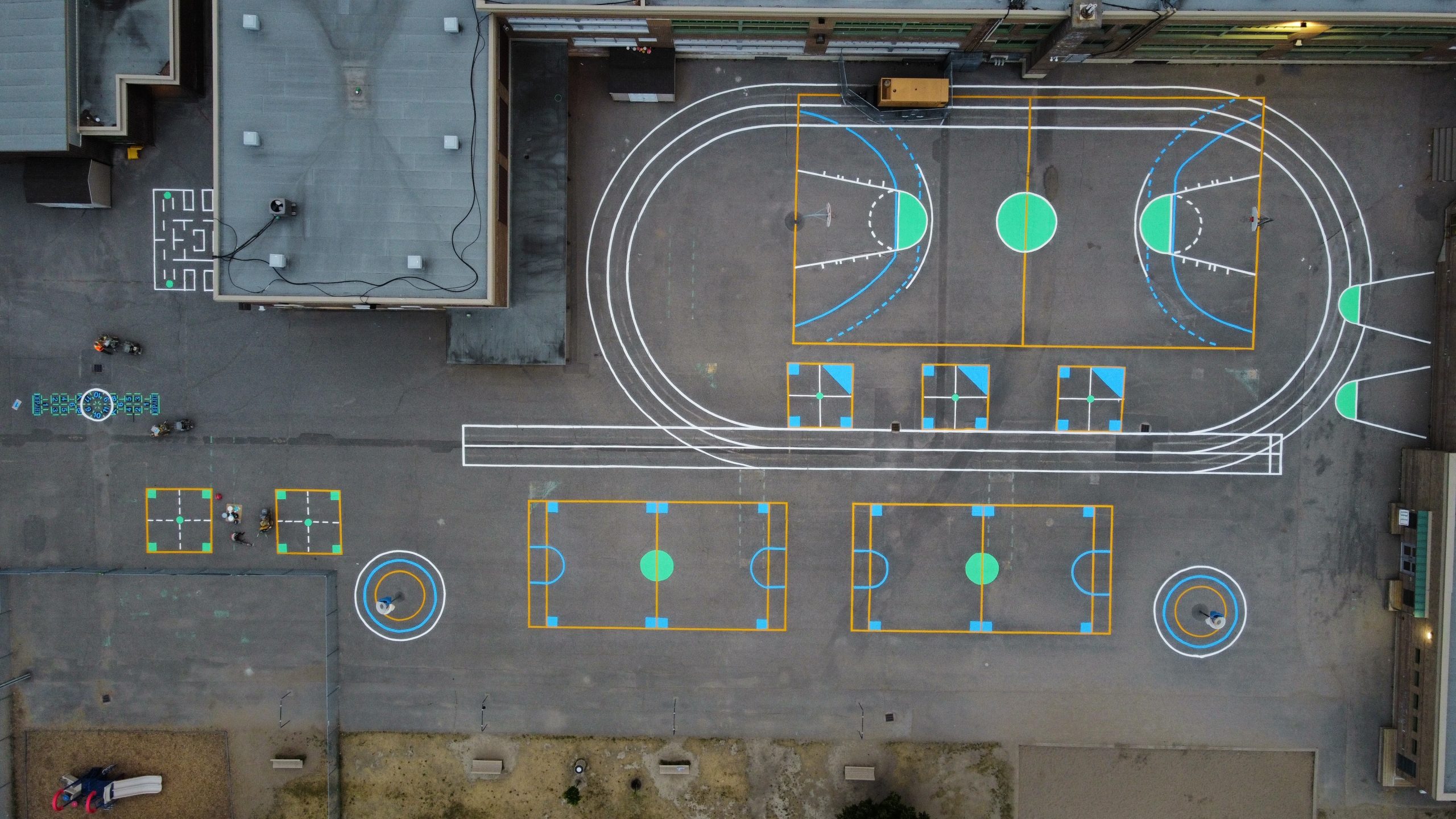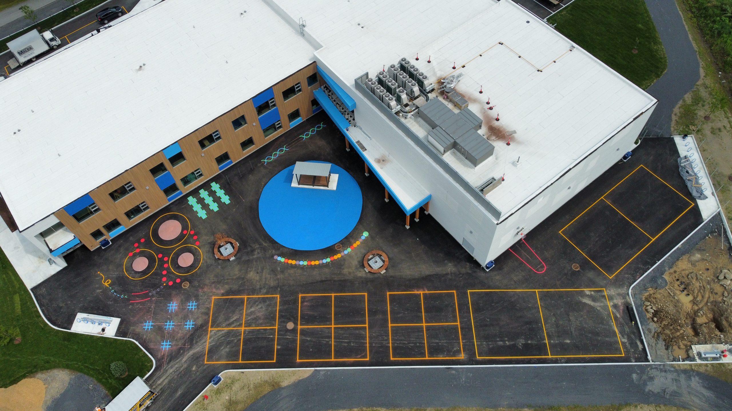 Service professionnel de marquage de lignes pour cours d’école, jeux, zones sécuritaires et stationnements scolaires au Québec.